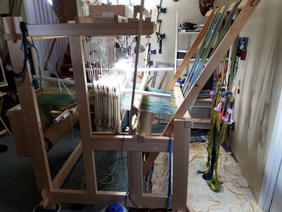 Susan Mayo's Gliding Trapeze This photo shows a warp extending from the back of my Louet compu-dobby loom up and over the front, across a gap to a Baby Wolf loom. The warp is placed around the top of the Baby Wolf and hangs down. I placed weights on the warp. The Baby Wolf has wheels. As I wind the warp onto the back beam of the Compu-dobby tension is maintained and the Baby Wolf glides towards the Louet.